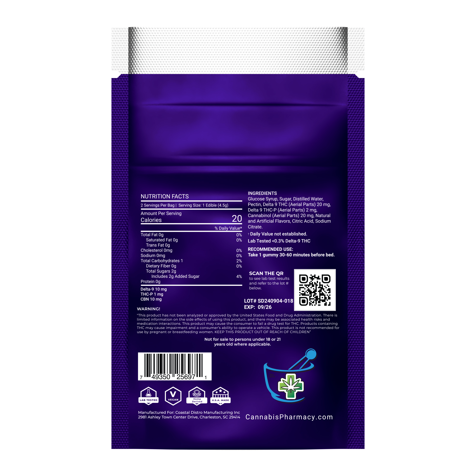 Cannabinoids per Gummy: 10mg CBN + 10mg Delta 9 THC + 1mg THCP