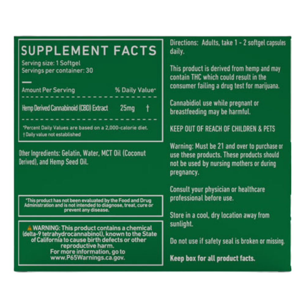 - 25mg CBD Per Capsule: A precise dose of CBD in each capsule for easy and consistent use.