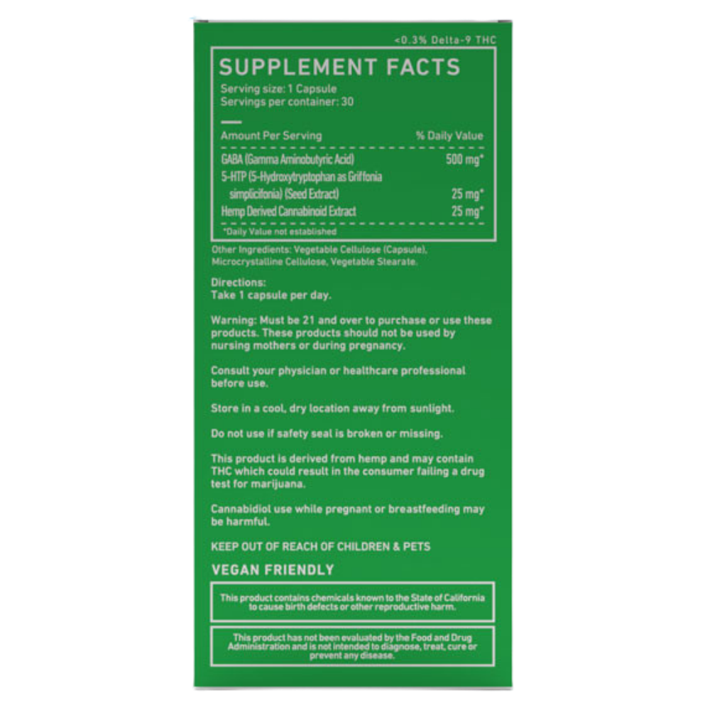 - Active Ingredients: 25mg CBD Isolate, 500mg GABA, 25mg 5-HTP