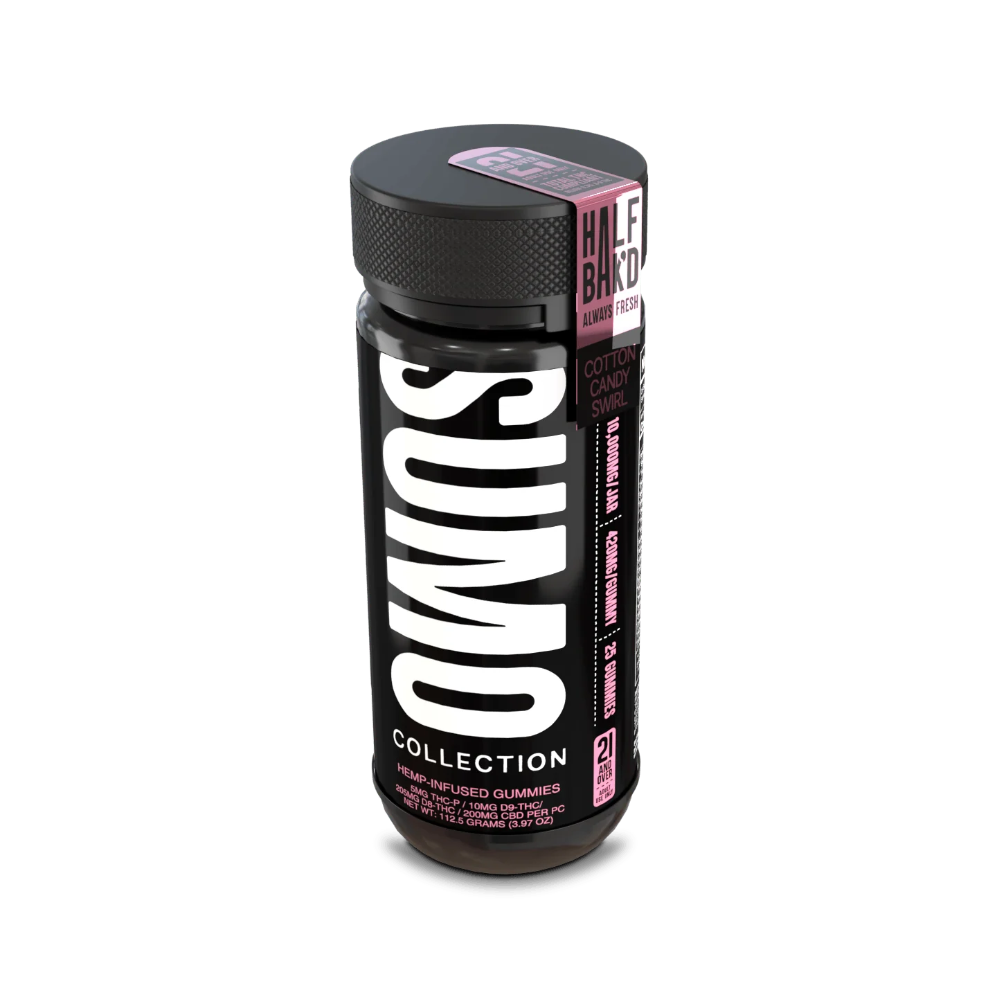 Experience Half Bak’d Cotton Candy Swirl Sumo Gummies – 25-count jar with 10,000mg total. High potency gummies blending THC-A, THC-P, and Delta-8.